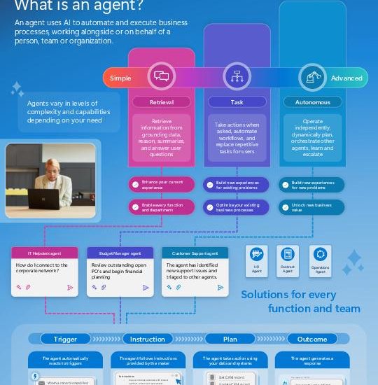Microsoft 365 Copilot Agents use AI to automate and execute business processes, working alongside or on behalf of people, teams, and entire organizations. View this infographic to see how agents interact with your data and systems to optimize work, streamline decisions, and enhance productivity. @Microsoft 365 @Microsoft Copilot
