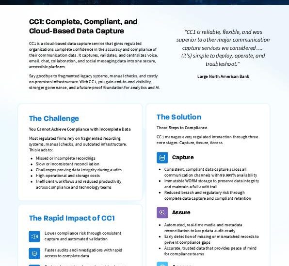 This solution brief shows how Custodia Compliance Cloud One (CC1) captures and validates regulated communications across channels, creating a single, secure, and audit-ready source of truth.