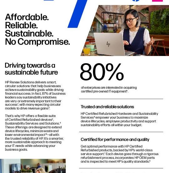 According to 87% of business leaders, sustainability is essential for success. ♻️ @HP Renew Solutions offers certified refurbished PCs, printers, and services that help extend product lifecycles and minimize waste.