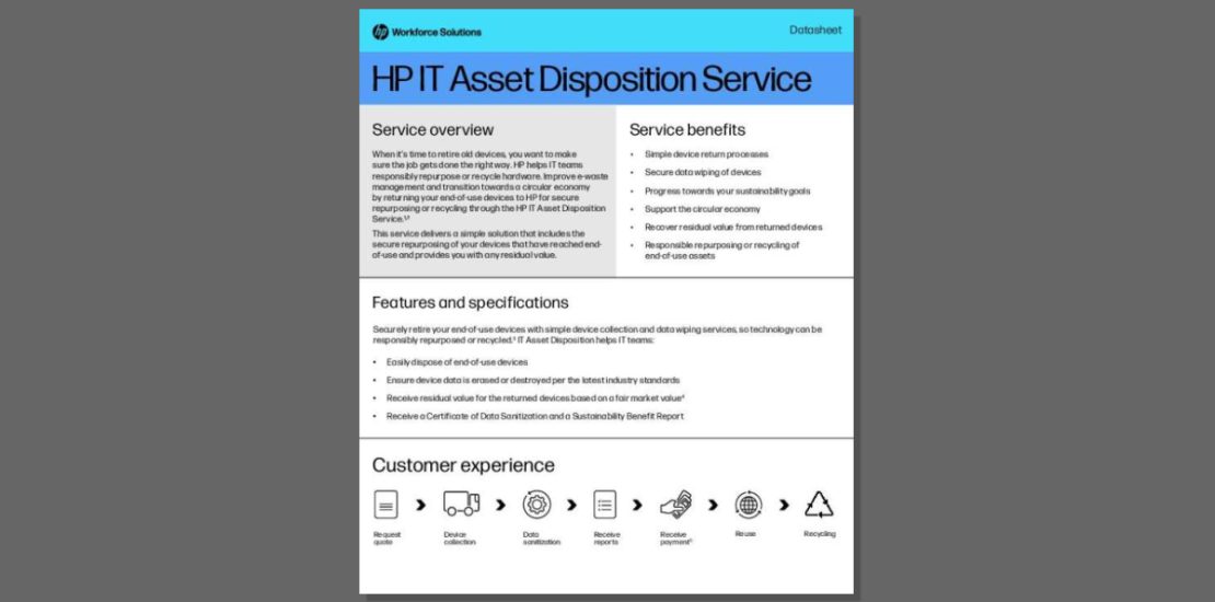 Retire devices the smart way 💡 The “HP IT Asset Disposition Service” wipes data, recycles responsibly, and may even return value. Download the datasheet for insights and message us to discuss how it can fit into your IT strategy. @HP #FutureOfWork