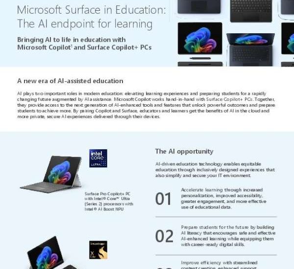 This overview of Surface devices and AI in education delves into how integrating Artificial Intelligence (AI) with Surface devices can remarkably reshape educational experiences. The focus is AI’s emergence in education via Microsoft Copilot – a companion working alongside Surface Copilot+ PCs, bringing a wealth of AI-enhanced tools and features for more productive and engaging learning. AI-driven education technology encapsulates inclusive designs ensuring equitable education while aiding in managing and safeguarding your IT environment. Moreover, it introduces increased personalization, greater user engagement, improved accessibility, and more effective usage of educational data; all streamlined for content creation. Check out this brief and to order the latest Surface device for education, contact us today.